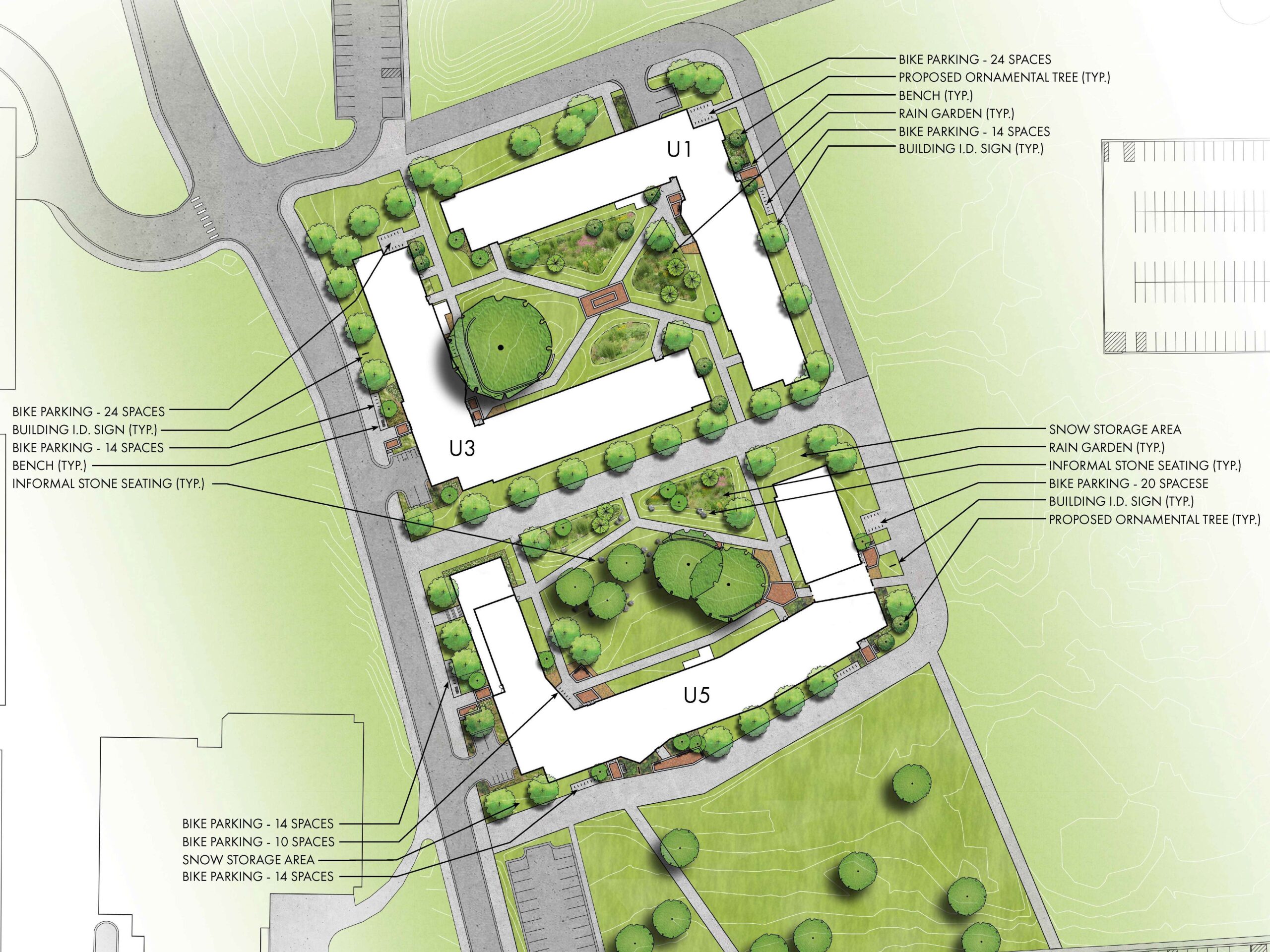 Johnson Hill Land Ethics Studio, in collaboration in InSite Design worked closely with a multi-disciplinary team to develop a site and landscaping plan for the proposed housing project on the University of Michigan’s North Campus. The project consisted of three 5-story residential towers with outdoor courtyard space to support student activities, streetscape treatments along Murfin Avenue, and connections to nearby facilities, bus routes, and the core of north campus.